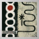 An abstract painting with a curvy line down the right, like a slalom course, then an asterisk thingy attached to it, and on the left, a white chain with red accent and small black and white stripes at the bottom.