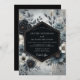 A moody and elegant design featuring deep slate blue blooms and subtle hints of white flowers against a soft, atmospheric background. This design evokes a sense of romantic mystery and sophisticated charm, perfect for a dramatic occasion.