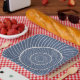 Cream fibonacci sequence spiral resembles a snail on a slate blue background A unique tableware option for your next retirement or mathematics themed party.