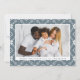 Festive holiday card featuring your horizontal photo framed in white with a slate blue and white nordic snowflake patterned background. Personalise the nordic snowflake Christmas card with your custom greeting and family name in slate blue lettering. The card reverses to display your personal message.