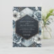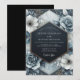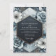 This design features a rich tapestry of deep slate blue blooms with delicate white accents, set against a marbled grey backdrop. Evoking a sense of refined elegance, the artistic floral arrangement offers a sophisticated and moody aesthetic. The intricate details of the blossoms create a striking visual for a memorable occasion.