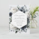This elegant design features a romantic arrangement of slate blue and soft white florals. Painterly roses in cream and white are beautifully contrasted by moody, deep blue blossoms. Subtle hints of sage green foliage complete this sophisticated and artistic composition for a timeless event.