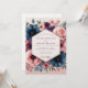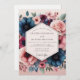 A romantic and elegant floral design features a lush arrangement of blossoms. The color palette combines deep slate blue, dusty blush pink, and rich burgundy for a dramatic, moody effect. Painterly anemones with dark centers are nestled amongst soft, delicate roses and subtle greenery against a pale, warm background.