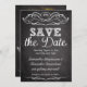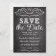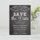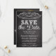 Slate chalkboard-look wedding save the date from the matching set features dark charcoal grey background with slate blackboard effect, and white chalk handwritten drawing look writing in the foreground. Decorative swirl motif adds a touch of casual elegance. All Designs Copyright © www.CustomInvitesOnline.com
