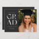 Celebrate your graduation in style with this modern graduation announcement and invitation. It features the word GRAD in stylish sans serif on a dark slate coloured background on the front, along with space for a photo. The back of the invitation has space for a second photo as well as room for all of the details of your graduation party.
