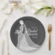 A chic bridal shower Paper plate featuring a bride wearing an elegant lace wedding gown on a slate grey background with beautiful script white text for your special bridal shower details.