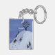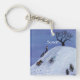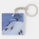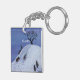 A watercolor painting of a children sledding adorns this customisable keychain!