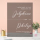 Acrylic wedding welcome sign printed with translucent black and your names in a large white script. Wedding welcome sign in white and transparent black with your names, wedding date, and wedding location. Welcome your wedding guests with this translucent black acrylic welcome sign with pretty white fonts and a sleek arrow.