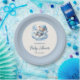 Celebrate the arrival of your little one with this charming paper plate featuring a watercolor baby bear peacefully sleeping on a cloud. The cute illustration is encased in a circular frame, surrounded by a serene blue backdrop. Perfect for adding a touch of whimsy to your baby shower party