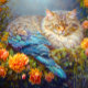 In a captivating scenario, envision discovering a KittyBird! Titled "Sleeping Cat with Blue Feathers Nesting in Roses." Picture a feline, in vivid detail, lounging among orange flowers, a beautiful fantasy animal embodying an enchanting kittybird. This magical beast, a brown kitten with blue feathers, creates a mystical cat-bird fusion amidst a nest adorned with twisting branches and leaves.