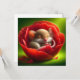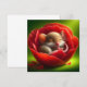 A cute, fluffy mouse peacefully sleeping inside a vibrant red poppy flower. The petals of the flower are soft and detailed, surrounding the mouse like a cosy bed. The background features gentle green hues, creating a serene and tranquil atmosphere, with a hint of sparkling light to add a magical touch.