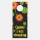 This door hanger says "Quiet, I am sleeping" on one side and on the other side it says "Please knock" on it.