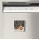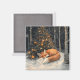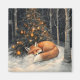 Magnet art featuring an adorable sleeping fox in front of a Christmas tree in the woods.