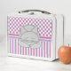 An image of a grey sleeping cat with a smile on it's face against a pink, purple and grey pattern is a unique design for feline lovers.
