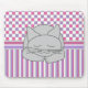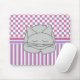 An image of a grey sleeping cat with a smile on it's face against a pink, purple and grey pattern is a unique design for feline lovers.