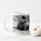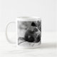 Black & white closeup photograph of Miniature Pinscher Puppy sleeping on the deck.