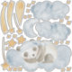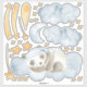 Children's room wall stickers featuring a sleeping panda bear sleeping on a cloud with gold shooting stars a moon and floating clouds. Perfect for a baby's nursery or a child's bedroom to encourage sleep time.