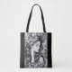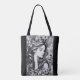 Carry art with you wherever you go. This chic tote bag features a beautiful monochrome illustration of a serene woman with closed eyes, her long flowing hair intertwined with delicate florals. The soft contrast and intricate details create a sense of calm and sophistication, making it the perfect accessory for daily errands, shopping, or as a stylish statement piece.