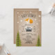 A baby shower invitation featuring an illustration of a baby fox sleeping surrounded by stars with illustration of mountains and trees.