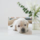 Closeup image of a tired 2 weeks old labrador retriever puppy lying down on a white carpet and looking at camera