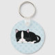 Sweet tuxedo cat cartoon illustration on a light blue pattern of hearts and cat paw prints.