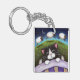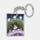 Acrylic keychain featuring a fantasy cat painting of a sleeping tuxedo cat, and 2 mice, counting sheep as they jump over a grassy hill. "Sheep Dreams" - Artwork © Lisa Marie Robinson. All rights reserved.