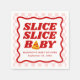 Complete your table décor with these “Slice, Slice, Baby” baby shower napkins, designed to coordinate perfectly with a pizza-themed baby shower. The design features a bold red wavy square border set against a soft pink checkerboard background, creating a fun and eye-catching look. “Slice Slice Baby” is displayed in bold red lettering, with a playful slice of pizza forming the letter “A,” accented with heart-shaped pepperoni for a sweet touch. Personalized text below allows you to add the mom-to-be’s name and baby shower date for a polished, cohesive presentation. Perfect for place settings, dessert tables, and drink stations, these baby shower napkins add a fun finishing touch to a pizza-themed baby shower celebrating a baby girl.