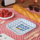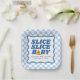 Add a fun, coordinated detail to your pizza-themed baby shower with these “Slice, Slice, Baby” paper plates. The design showcases bold dark blue lettering set within a dark blue wavy border, paired with a light blue checkerboard background for a cheerful look. A cute slice of pizza replaces the letter “A,” featuring heart-shaped pepperoni that ties into the theme. The plates can be personalized with the mom-to-be’s name and baby shower date, creating a custom detail guests will love. Ideal for serving snacks, desserts, or cake, these baby shower paper plates are a perfect fit for welcoming a baby boy.