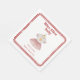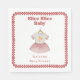 "slice slice baby" pizza themed baby shower featuring illustration of a baby dress with red striped sleeves and illustration of pizza at centre. Border is hand drawn red chequerboard design with rounded corners.