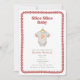 "slice slice baby" pizza themed baby shower featuring illustration of a baby bodysuit with red striped sleeves and illustration of pizza at centre. Border is hand drawn red chequerboard design with rounded corners.