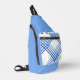 Pocket has white background and shows blue lines in varying five shades, dark to light, bottom to top. Two Sets of stripes are placed diagonally, meeting at the centre of top and bottom. These two sets are then replicated and flipped, so that they cross. Majority of bag is a solid colour the the medium blue tone.