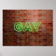 SlipperyJoe illuminated gay neon sign bright vivid electric green lights letters mounted reddish-brown brick wall gay pride gifts identity celebration LGBTQIA urban industrial look celebration love identity community live your truth visibility power vibrant glow contrasts textured backdrop sleek electric curves artistic casting lively aura