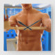 SlipperyJoe muscular man abs locker room tiled flooring gay pride gifts LGBTQIA artistic stretched gymnastic tape shirtless defined torso arms sixpack blue lockers wooden bench gym athletic facility grip strength shirtless chest 6-pack