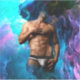 SlipperyJoe muscular man underwear bulge vibrant hues blue teal purple cloud-like abstraction gay pride gifts LGBTQIA artistic dreamlike abstract energy psychedelic surrealism cosmic effect surreal and imaginative background hand rests over chest