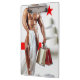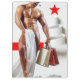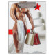SlipperyJoe's Christmas shopping white paper spirals tree topped with vibrant red star striking holiday theme bold scarlet stripe runs horizontally sexy male chest muscular man partially clad bedsheet artistic shirtless guy gift-giving seasonal shopping bags gay pride gifts cheer LGBTQIA