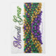 SlipperyJoe's iconic Mardi Gras–themed image elegant flowing script yellow outline shiny metallic bead necklaces gifts new orleans traditional purple gold green artistic symmetrical decorative pattern glossy reflective celebratory parade ready emphasizing abundance sparkles festival colors Carnival Fat Tuesday festival lively vibrant spirited party extravagant cultural masked energy