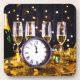 SlipperyJoe's New Year thrilling moments classic clock reads 11:55 evoking anticipation countdown energy four filled champagne flutes bottle of bubbly sparkling wine warmth and elegant celebratory toast golden confetti ornaments pine branches seasonal texture festive LGBTQIA charm soft string lights glow warmly