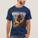 I give wanted to give this a 4 instead of a 5 because these Basic DARK T0shirts run unexpectedly SLIM or Narrow. Which is great if you do not have a potbelly, but I have a paunch. It isn't the shirt's fault that I've got a beer belly. The design and shirt itself is a quality cotton shirt. The color is more of a deep purple, but still a very pretty color. The Basic DARK T-shirts run a bit SLIMMER than the Basic Ts. The neck is a fraction narrower (or seems to be narrower) also. I'm a paunchy middle-aged woman and my neck is 12 inches (31cm) thick and the neckline fell about the same as in the photo of the man, and I had the desire to tug it a bit. So if you're a thick necked man or like loose shirts, be aware these are slimmer shirts. Once I get rid of my lockdown paunch it'll look great. The shirt washed well in cold water with no apparent bleeding. We don't have a dryer, so it hung dry. Did not shrink. Love the colors and the design. The design looks smaller on my shirt than it does on the model on-line. But still, it looks good on the shirt. The printing looks as it does on the model, just the size seems fractionally smaller. Washed garment in cold water, hung dry and design appeared unaffected.