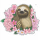 A cute sloth sitting amongst pink flowers all against a backdrop of blue