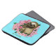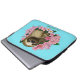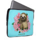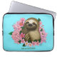 A cute sloth sitting amongst pink flowers against a backdrop of blue.