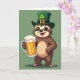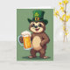 This card shows a cheerful cartoon sloth centered on a muted green background, looking like it’s ready to toast a friend 💚. Its rich brown fur has gentle texture with lighter underparts, and its big black eyes gleam above a wide, friendly smile that feels inviting. The sloth wears an emerald leprechaun hat with a black band, a gold buckle, and a small green shamrock tucked on the front. In its left paw, it lifts a glass mug of golden-amber drink topped with a thick white foam, with tiny bubbles visible in the liquid. Its right arm rests on its hip, giving it a confident stance, like it’s posing for someone special just out of frame ☘️. Any greeting text would sit neatly above the character in a light color such as white or pale yellow so it stands out against the green. The scene stays simple and focused, with the sloth, the hat details, and the frothy mug as the main visual elements.