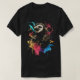 I give wanted to give this a 4 instead of a 5 because these Basic DARK T0shirts run unexpectedly SLIM or Narrow. Which is great if you do not have a potbelly, but I have a paunch. It isn't the shirt's fault that I've got a beer belly. The design and shirt itself is a quality cotton shirt. The color is more of a deep purple, but still a very pretty color. The Basic DARK T-shirts run a bit SLIMMER than the Basic Ts. The neck is a fraction narrower (or seems to be narrower) also. I'm a paunchy middle-aged woman and my neck is 12 inches (31cm) thick and the neckline fell about the same as in the photo of the man, and I had the desire to tug it a bit. So if you're a thick necked man or like loose shirts, be aware these are slimmer shirts. Once I get rid of my lockdown paunch it'll look great. The shirt washed well in cold water with no apparent bleeding. We don't have a dryer, so it hung dry. Did not shrink. Love the colors and the design. The design looks smaller on my shirt than it does on the model on-line. But still, it looks good on the shirt. The printing looks as it does on the model, just the size seems fractionally smaller. Washed garment in cold water, hung dry and design appeared unaffected.