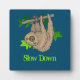 A cute drawing of a brown sloth clinging to a branch with leaves, hanging upside down. The words slow down written underneath in a cool lime green grunge font.
