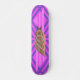 This skate board has a brown and ginger slug in the middle. The background is made up of a mixture of purple and pink lines forming diamond and arrow shapes all over the skateboard.