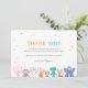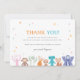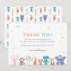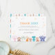 This cheerful thank you card design features the full lineup of beloved Slumberkins characters standing together along the bottom edge, creating a sweet and memorable closing to a special celebration. The bold “THANK YOU!” headline appears in playful multicolored lettering, surrounded by scattered pastel stars that add a festive sparkle across the clean white background. Beneath the headline, a heartfelt birthday message adds a warm and personal touch, with space for a customizable signature to make it uniquely special. The combination of soft tones and vibrant character colors creates a balanced, joyful look that coordinates beautifully with a Slumberkins-themed birthday party.
