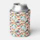 This can cooler has a mid-century modern design of small, rounded triangles with white centres and ovals, in the middle in 70s colours, overlapping each other. Want different colours? Message me.