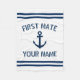 Small nautical fleece blanket for first mate. Add your own custom name. Cute maritime gift idea for new baby, kids, deckhand, crew, sailor, skipper, boat captain, boat owner, sailing enthusiast, yachting pro, boss, dad, husband, friend, wife etc. Navy blue and white ship anchor design plus stripes. Customisable background colour and text. Unique Christmas Holiday and Birthday presents for him or her.