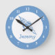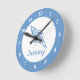 Space rocket wall clock with custom baby name Cute gift idea for little kids room. Blue and white nursery decoration with personalised name. For boys and girls. Small size wall clocks for newborn bedroom.