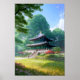 Amidst the verdant tranquillity of the forest, a small Japanese temple sits nestled in its own serene garden. The lush greenery enveloping the temple provides a peaceful backdrop to the vibrancy of the red and white flowers that adorn its periphery. A true haven of calm and quiet, this digital artwork captures the essence of the temple's beauty, an expression of its harmonious coexistence with the natural world that surrounds it.