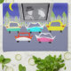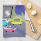 Pass the popcorn! This Small Town Drive-In Movie Kitchen Towel will transport you to a simpler time, when gas was cheap, rock and roll was young, and the movie stars of Hollywood's Golden Age shined brighter than the night sky. The design features the rear view of five, virtually indestructible, retro cars in colours of red, pink, turquoise, jade and yellow. In front of the cars is a giant movie screen, showing a black and white movie, featuring two, star-crossed lovers in hats and trench coats. In the background, there is a grey, picket fence, a row of green, cedar trees, a royal blue sky and a yellow, crescent moon. We hope you've enjoyed our feature presentation!